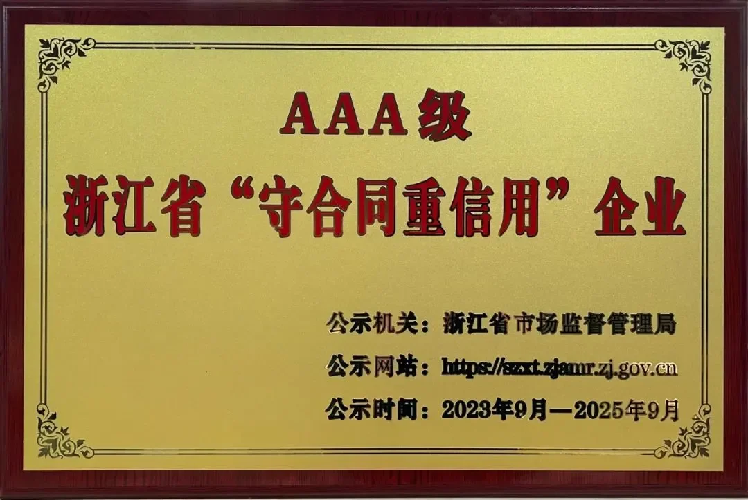 Zhejiang Province AAA-level "Contract-abiding and Credit-worthy" enterprises refer to enterprises that strictly abide by contract agreements and keep their promises in business activities, and have good business and social reputation, and are rated as the highest by the Zhejiang Provincial Government and relevant departments.These enterprises have strong competitiveness and advantages in the market competition, can obtain more business opportunities and resources, and can better serve the society and customers. At the same time, these enterprises can also set an example for other enterprises and promote the honest operation and healthy development of the whole industry.
